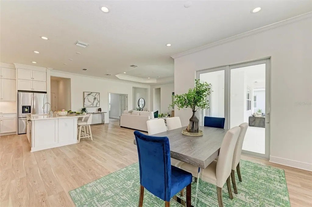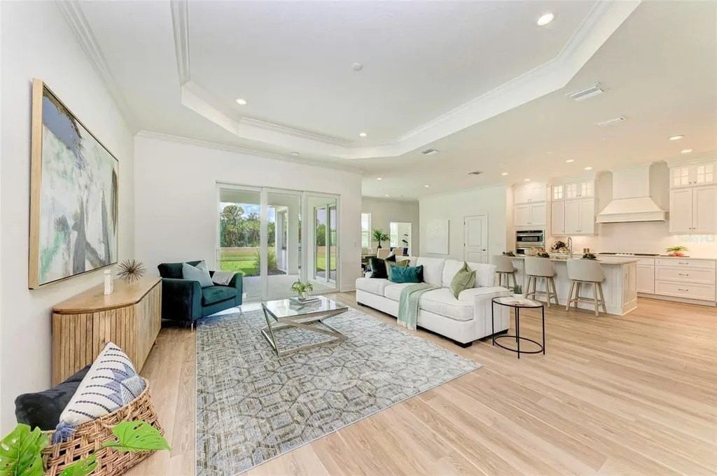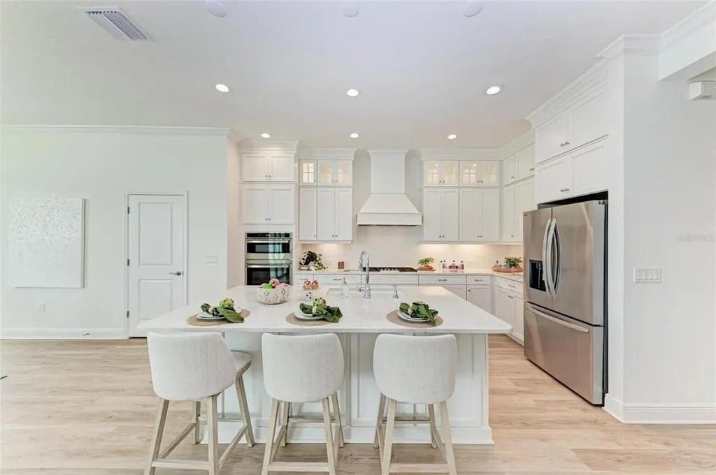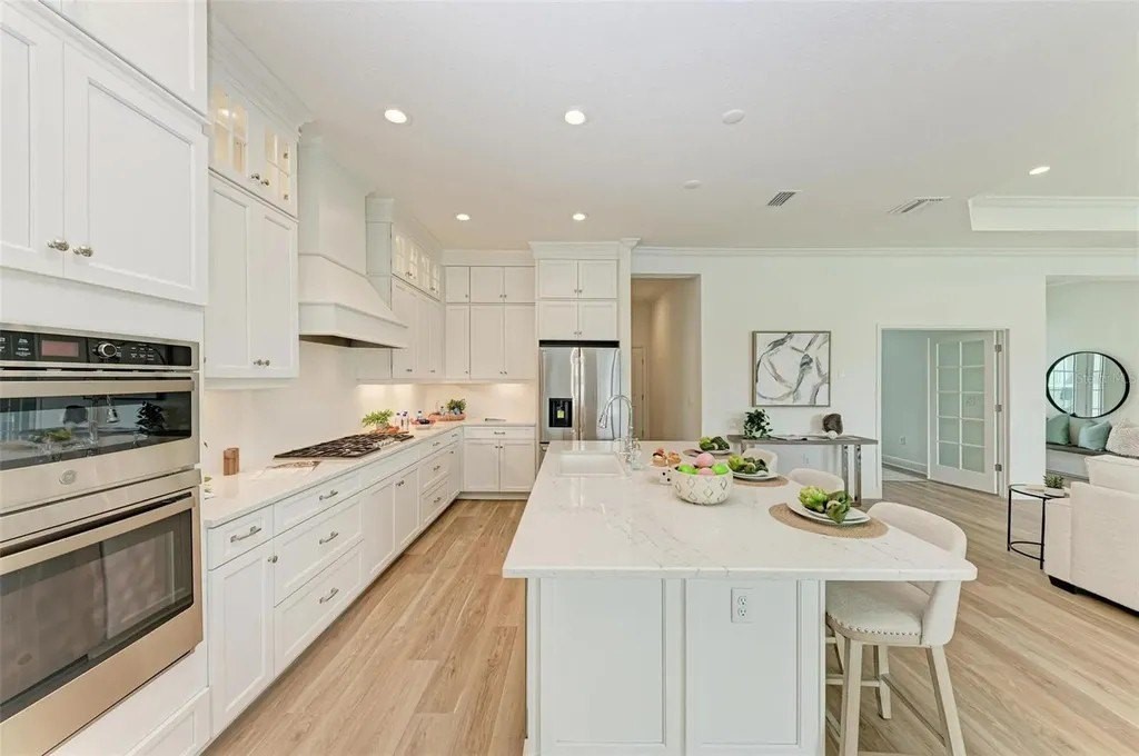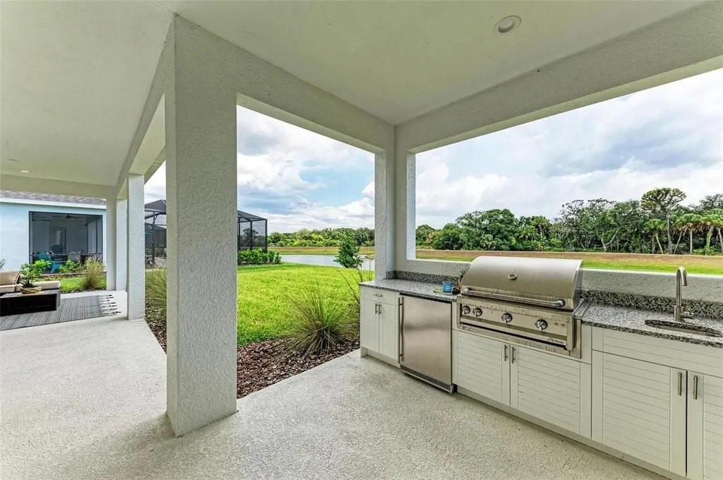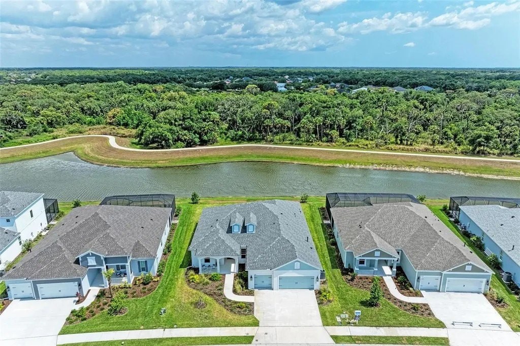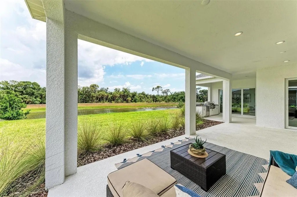 A rare opportunity to own a NEVER LIVED IN, designer-upgraded home on one of Canoe Creek's premier waterfront lot represents a remarkable value, offered far below original cost. This exceptional Captiva plan provides immediate occupancy-no construction delays, long wait times, or uncertainties. As one of the final homes in the Coastal Collection for this phase, this home offers the most sought-after options, like no other on the market featuring IMPACT WINDOWS & SLIDERS, EXTENDED LANAI OPTION WITH AN OUTDOOR KITCHEN, EXTENDED PRIMARY CLOSET OPTION, TWO OFFICES, SHOWSTOPPING KITCHEN AND EXTENDED 3-CAR GARAGE. Perfectly positioned with peaceful lake views, a serene preserve backdrop, and a scenic walking path with no front-facing neighbors for added privacy. A welcoming front covered porch leads into a thoughtfully designed interior featuring an elegant glass entry door. The open-concept layout is highlighted by luxury vinyl plank flooring throughout-no carpet-along with a versatile bonus room/office with double doors, another dedicated private den or office, and two generously sized guest bedrooms. One guest suite includes an en-suite bathroom, providing comfort and privacy for visitors. Crown molding and tray ceilings with refined detailing in the owner's suite, bonus room, and great room add a sophisticated touch throughout the home. The chef's kitchen is a true centerpiece, featuring custom double-stacked cabinetry with lighting, soft-close drawers, pull-out shelving, a custom curved hood, and a large island with decorative panels and a scratch-resistant undermount sink. High-end appliances include a five-burner Fulgar Milano gas cooktop, built-in oven, convection microwave, stainless steel dishwasher, and quartz countertops. The owner's suite is filled with natural light and offers a spacious walk-in closet and a spa-inspired bath with a large walk-in shower, designer tilework, quartz countertops, and premium fixtures. Designed for seamless indoor-outdoor living, the extended lanai features multiple entertaining areas, access from the great room, dining room, and bonus room, and a built-in outdoor kitchen with granite countertops. There is ample space to add a private pool, making it ideal for entertaining or relaxing. Additional highlights include smart home technology, pre-wiring for a security system, wireless access point, epoxy-finished garage flooring, upgraded pantry shelving, and a spacious laundry room with upper cabinets and a laundry sink. Canoe Creek is a low-maintenance community with NO CDD fees, offering resort-style amenities including a lagoon pool and spa, fitness center, clubhouse, pickleball courts, dog park, community events, and an on-site lifestyle director. Ideally located near Lakewood Ranch, the Manatee River, Sarasota, St. Petersburg, and Tampa, with convenient access to Gamble Creek Farmers Market for fresh local offerings.